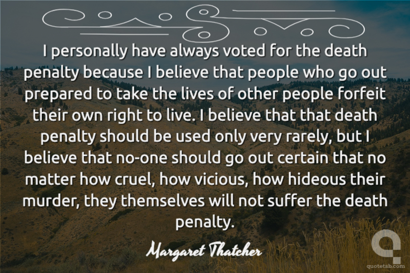 I personally have always voted for the death penalty because I believe that people who go out prepared to take the lives of other people forfeit their own right to live. I believe that that death penalty should be used only very rarely, but I believe that no-one should go out certain that no matter how cruel, how vicious, how hideous their murder, they themselves will not suffer the death penalty.