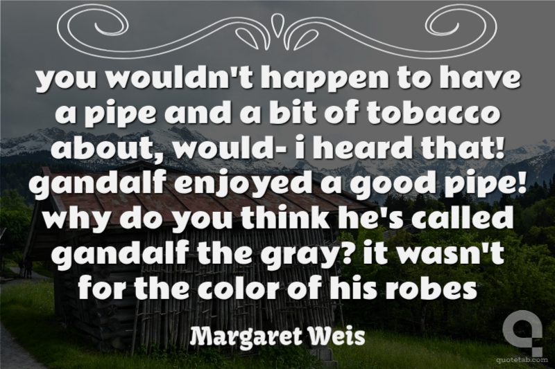 you wouldn't happen to have a pipe and a bit of tobacco about, would- i heard that! gandalf enjoyed a good pipe! why do you think he's called gandalf the gray? it wasn't for the color of his robes
