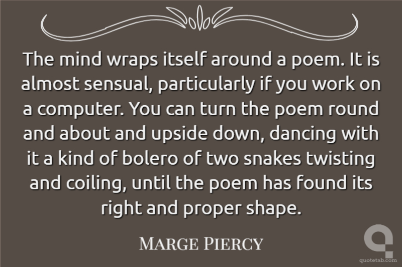 The mind wraps itself around a poem. It is almost sensual, particularly if you work on a computer. You can turn the poem round and about and upside down, dancing with it a kind of bolero of two snakes twisting and coiling, until the poem has found its right and proper shape.