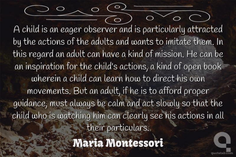 A child is an eager observer and is particularly attracted by the actions of the adults and wants to imitate them. In this regard an adult can have a kind of mission. He can be an inspiration for the child's actions, a kind of open book wherein a child can learn how to direct his own movements. But an adult, if he is to afford proper guidance, must always be calm and act slowly so that the child who is watching him can clearly see his actions in all their particulars.