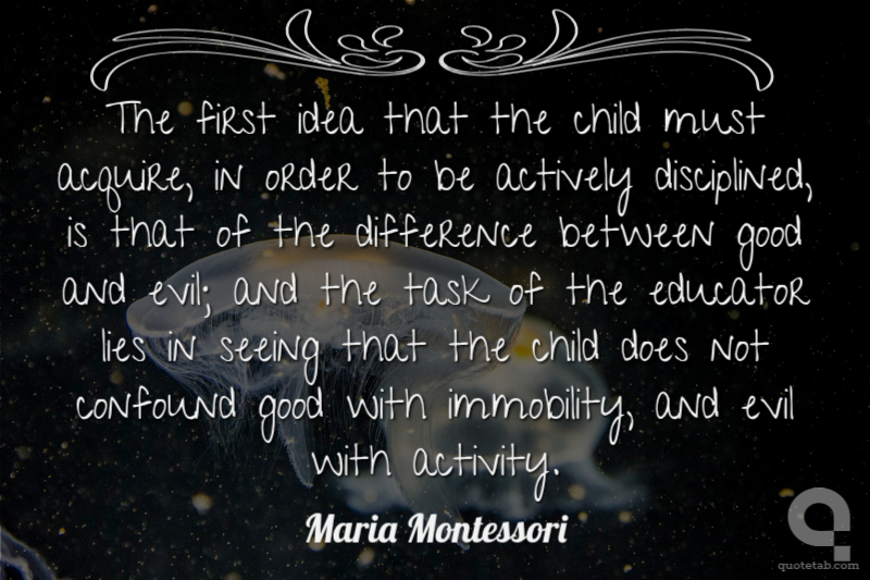The first idea that the child must acquire, in order to be actively disciplined, is that of the difference between good and evil; and the task of the educator lies in seeing that the child does not confound good with immobility, and evil with activity.