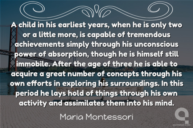 A child in his earliest years, when he is only two or a little more, is capable of tremendous achievements simply through his unconscious power of absorption, though he is himself still immobile. After the age of three he is able to acquire a great number of concepts through his own efforts in exploring his surroundings. In this period he lays hold of things through his own activity and assimilates them into his mind.