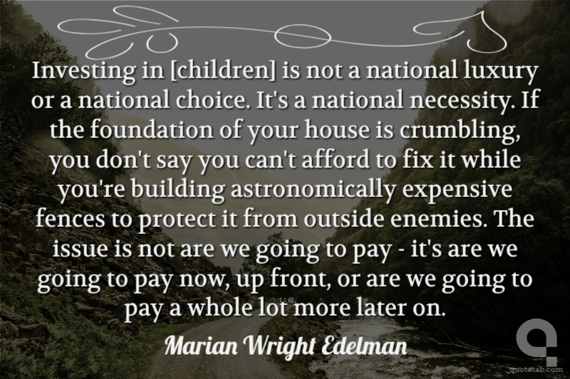 Investing in [children] is not a national luxury or a national choice. It's a national necessity. If the foundation of your house is crumbling, you don't say you can't afford to fix it while you're building astronomically expensive fences to protect it from outside enemies. The issue is not are we going to pay - it's are we going to pay now, up front, or are we going to pay a whole lot more later on.
