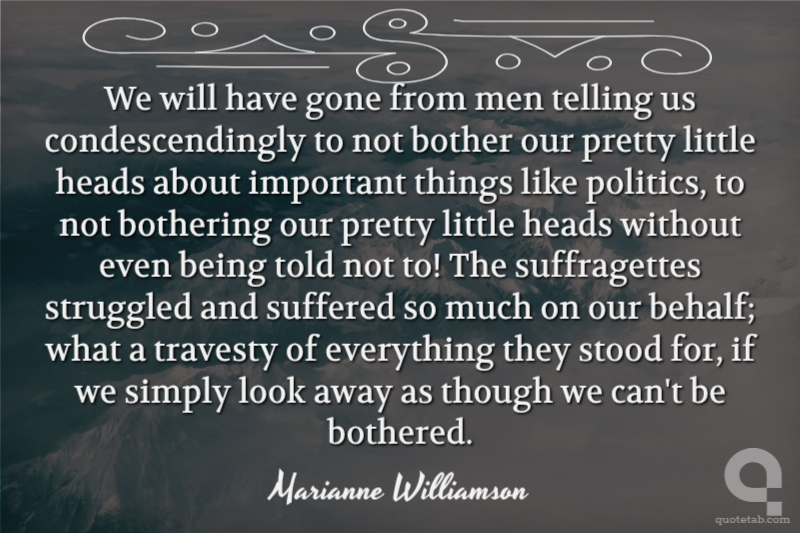We will have gone from men telling us condescendingly to not bother our pretty little heads about important things like politics, to not bothering our pretty little heads without even being told not to! The suffragettes struggled and suffered so much on our behalf; what a travesty of everything they stood for, if we simply look away as though we can't be bothered.