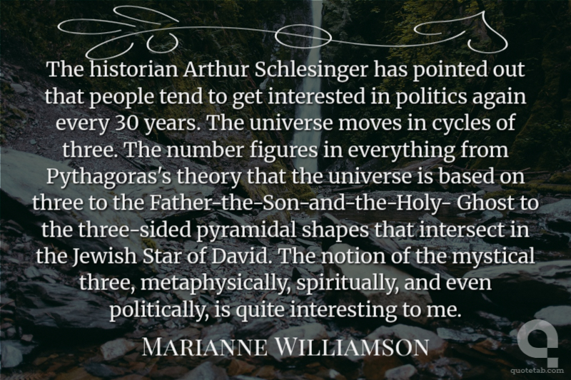 The historian Arthur Schlesinger has pointed out that people tend to get interested in politics again every 30 years. The universe moves in cycles of three. The number figures in everything from Pythagoras's theory that the universe is based on three to the Father-the-Son-and-the-Holy- Ghost to the three-sided pyramidal shapes that intersect in the Jewish Star of David. The notion of the mystical three, metaphysically, spiritually, and even politically, is quite interesting to me.