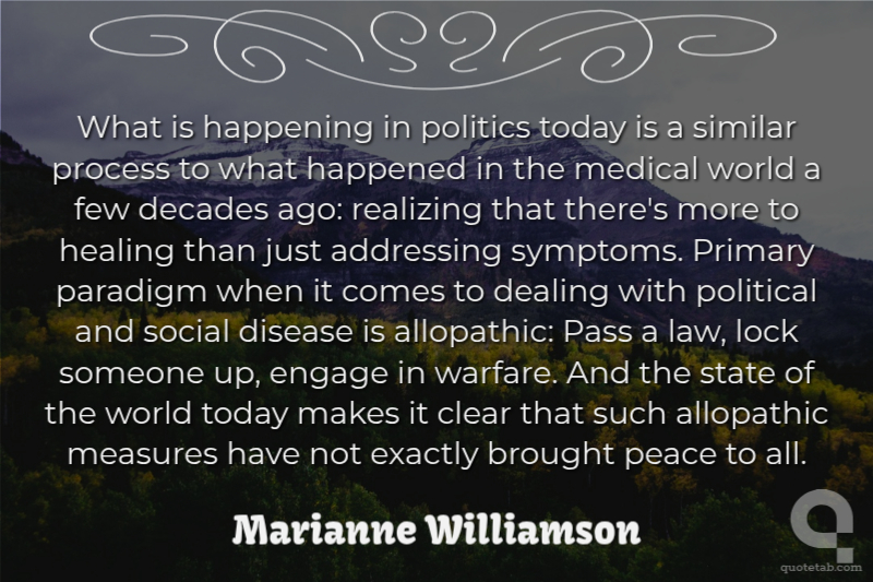 What is happening in politics today is a similar process to what happened in the medical world a few decades ago: realizing that there's more to healing than just addressing symptoms. Primary paradigm when it comes to dealing with political and social disease is allopathic: Pass a law, lock someone up, engage in warfare. And the state of the world today makes it clear that such allopathic measures have not exactly brought peace to all.
