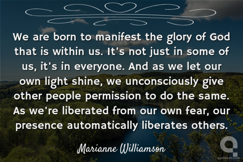We are born to manifest the glory of God that is within us. It's not just in some of us, it's in everyone. And as we let our own light shine, we unconsciously give other people permission to do the same. As we're liberated from our own fear, our presence automatically liberates others.