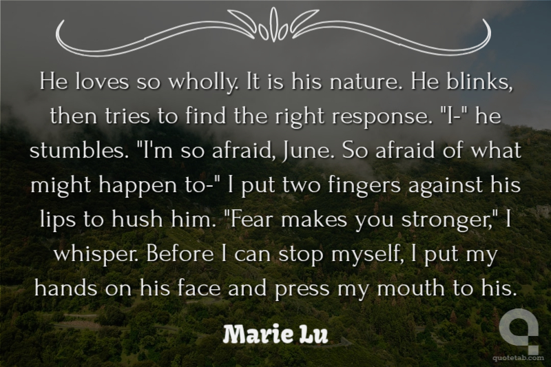 He loves so wholly. It is his nature. He blinks, then tries to find the right response. "I-" he stumbles. "I'm so afraid, June. So afraid of what might happen to-" I put two fingers against his lips to hush him. "Fear makes you stronger," I whisper. Before I can stop myself, I put my hands on his face and press my mouth to his.