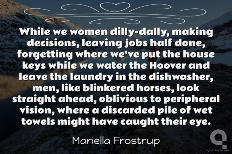 While we women dilly-dally, making decisions, leaving jobs half done, forgetting where we've put the house keys while we water the Hoover and leave the laundry in the dishwasher, men, like blinkered horses, look straight ahead, oblivious to peripheral vision, where a discarded pile of wet towels might have caught their eye.
