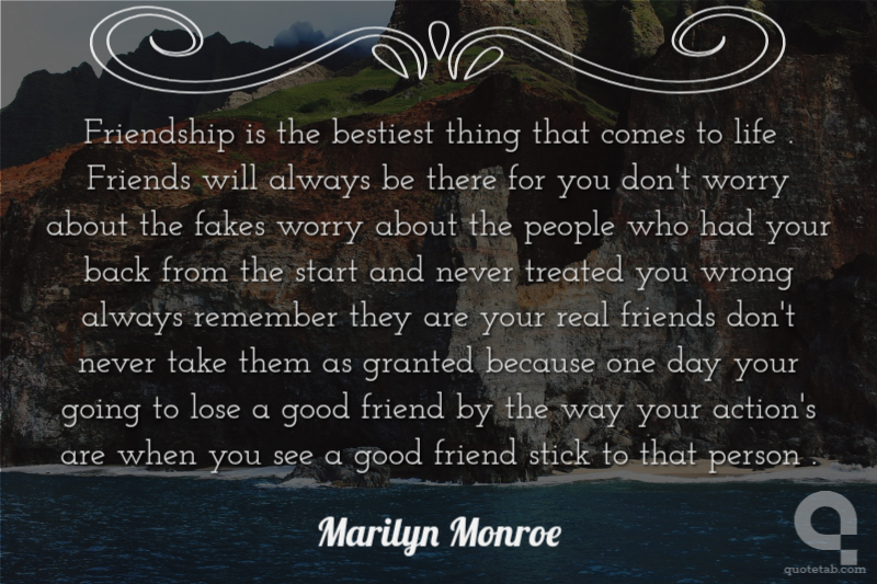 Friendship is the bestiest thing that comes to life . Friends will always be there for you don't worry about the fakes worry about the people who had your back from the start and never treated you wrong always remember they are your real friends don't never take them as granted because one day your going to lose a good friend by the way your action's are when you see a good friend stick to that person .