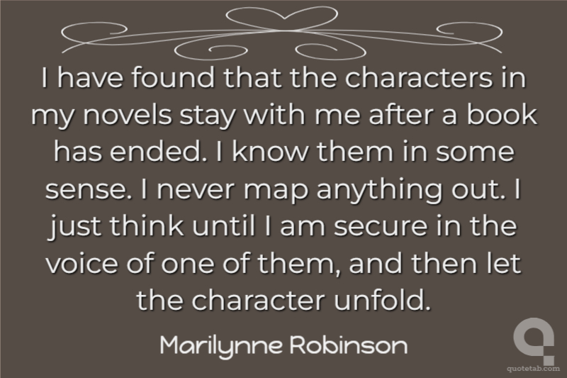 I have found that the characters in my novels stay with me after a book has ended. I know them in some sense. I never map anything out. I just think until I am secure in the voice of one of them, and then let the character unfold.