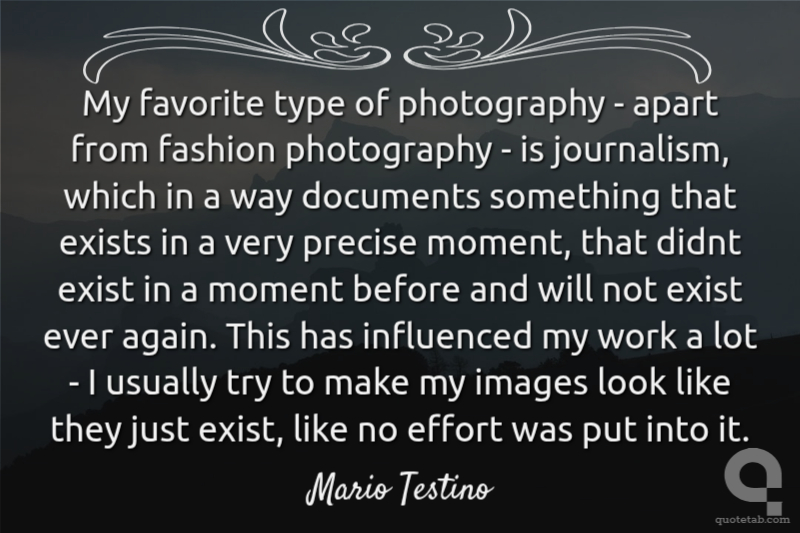 My favorite type of photography - apart from fashion photography - is journalism, which in a way documents something that exists in a very precise moment, that didnt exist in a moment before and will not exist ever again. This has influenced my work a lot - I usually try to make my images look like they just exist, like no effort was put into it.
