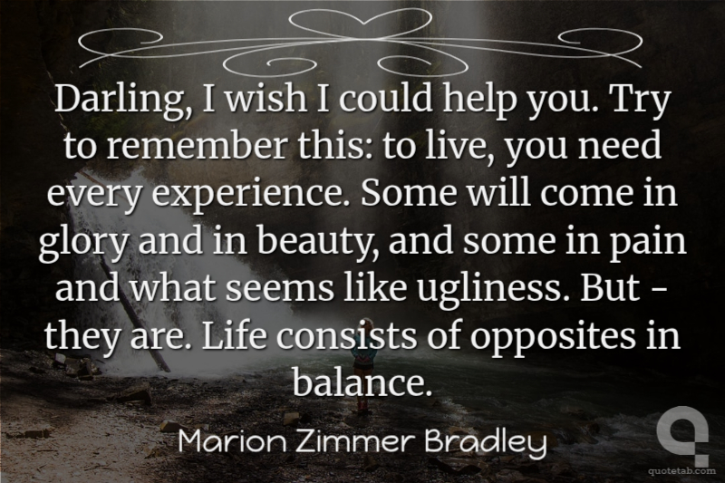 Darling, I wish I could help you. Try to remember this: to live, you need every experience. Some will come in glory and in beauty, and some in pain and what seems like ugliness. But - they are. Life consists of opposites in balance.