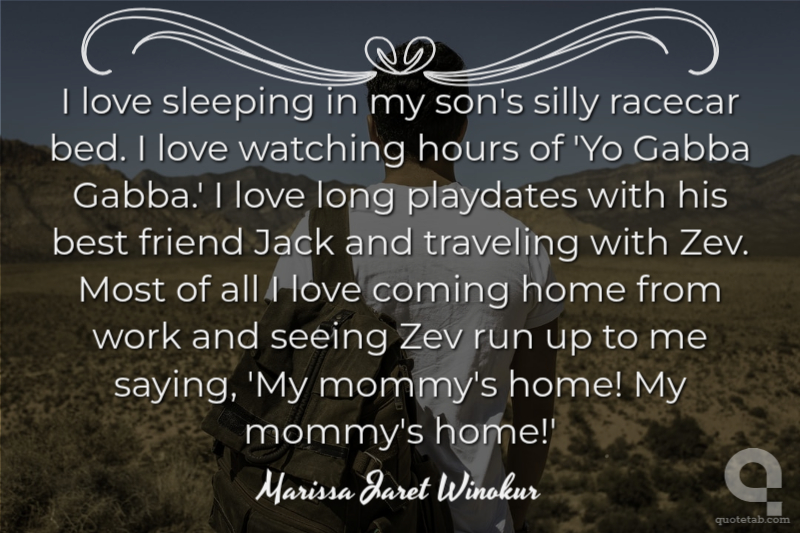 I love sleeping in my son's silly racecar bed. I love watching hours of 'Yo Gabba Gabba.' I love long playdates with his best friend Jack and traveling with Zev. Most of all I love coming home from work and seeing Zev run up to me saying, 'My mommy's home! My mommy's home!'