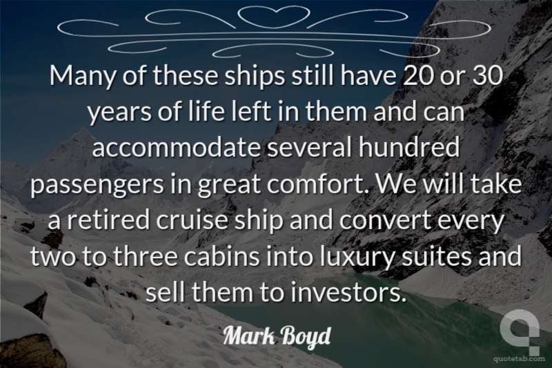 Many of these ships still have 20 or 30 years of life left in them and can accommodate several hundred passengers in great comfort. We will take a retired cruise ship and convert every two to three cabins into luxury suites and sell them to investors.