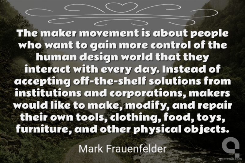 The maker movement is about people who want to gain more control of the human design world that they interact with every day. Instead of accepting off-the-shelf solutions from institutions and corporations, makers would like to make, modify, and repair their own tools, clothing, food, toys, furniture, and other physical objects.