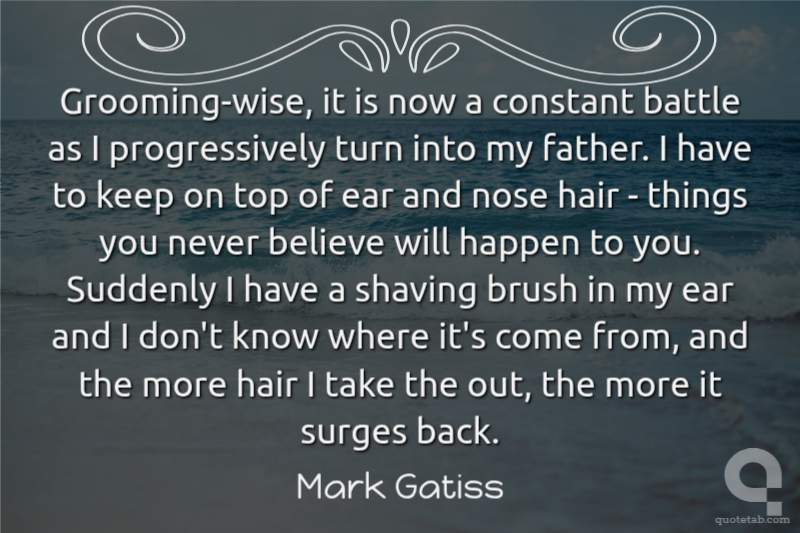 Grooming-wise, it is now a constant battle as I progressively turn into my father. I have to keep on top of ear and nose hair - things you never believe will happen to you. Suddenly I have a shaving brush in my ear and I don't know where it's come from, and the more hair I take the out, the more it surges back.