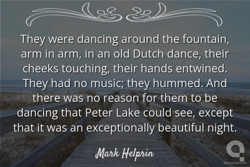 They were dancing around the fountain, arm in arm, in an old Dutch dance, their cheeks touching, their hands entwined. They had no music; they hummed. And there was no reason for them to be dancing that Peter Lake could see, except that it was an exceptionally beautiful night.