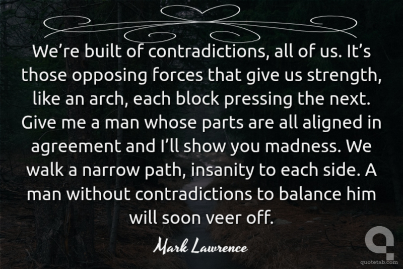 We’re built of contradictions, all of us. It’s those opposing forces that give us strength, like an arch, each block pressing the next. Give me a man whose parts are all aligned in agreement and I’ll show you madness. We walk a narrow path, insanity to each side. A man without contradictions to balance him will soon veer off.