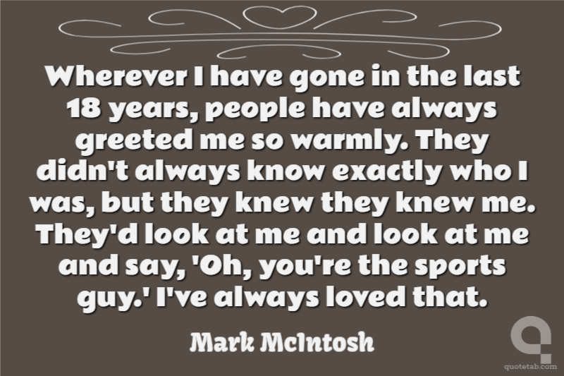 Wherever I have gone in the last 18 years, people have always greeted me so warmly. They didn't always know exactly who I was, but they knew they knew me. They'd look at me and look at me and say, 'Oh, you're the sports guy.' I've always loved that.