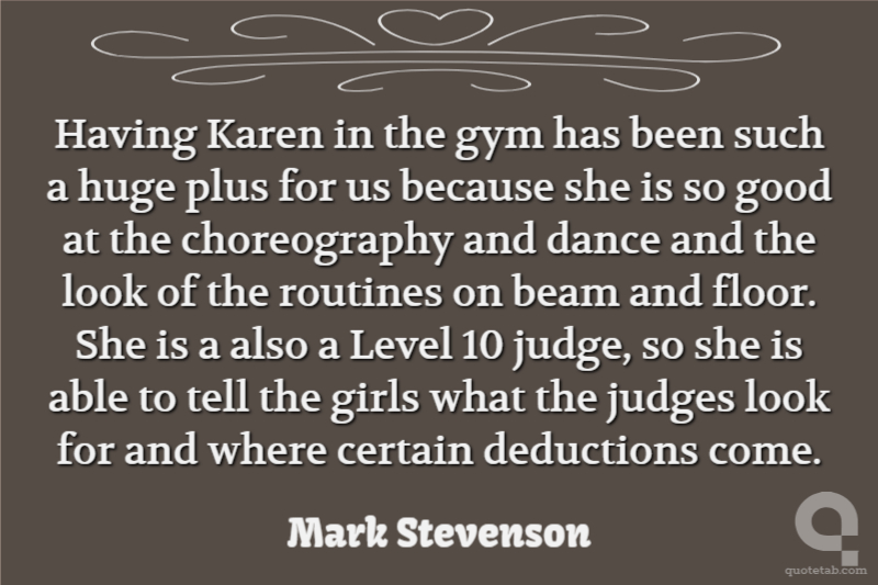 Having Karen in the gym has been such a huge plus for us because she is so good at the choreography and dance and the look of the routines on beam and floor. She is a also a Level 10 judge, so she is able to tell the girls what the judges look for and where certain deductions come.