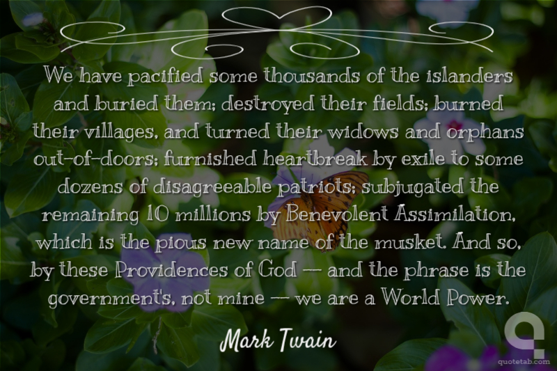 We have pacified some thousands of the islanders and buried them; destroyed their fields; burned their villages, and turned their widows and orphans out-of-doors; furnished heartbreak by exile to some dozens of disagreeable patriots; subjugated the remaining 10 millions by Benevolent Assimilation, which is the pious new name of the musket. And so, by these Providences of God -- and the phrase is the government's, not mine -- we are a World Power.