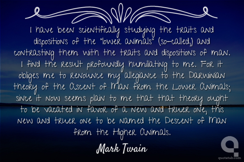 I have been scientifically studying the traits and dispositions of the "lower animals" (so-called,) and contrasting them with the traits and dispositions of man. I find the result profoundly humiliating to me. For it obliges me to renounce my allegiance to the Darwinian theory of the Ascent of Man from the Lower Animals; since it now seems plain to me that that theory ought to be vacated in favor of a new and truer one, this new and truer one to be named the Descent of Man from the Higher Animals.