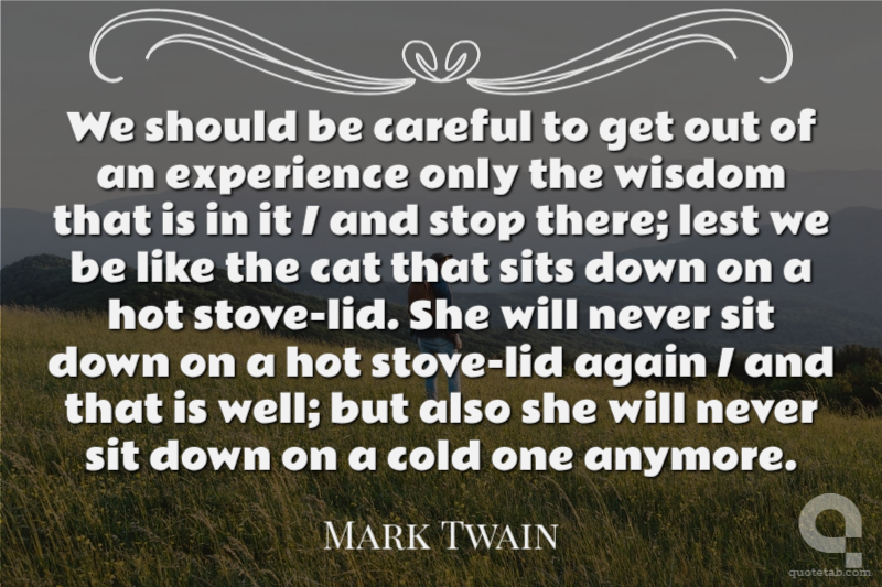 We should be careful to get out of an experience only the wisdom that is in it / and stop there; lest we be like the cat that sits down on a hot stove-lid. She will never sit down on a hot stove-lid again / and that is well; but also she will never sit down on a cold one anymore.