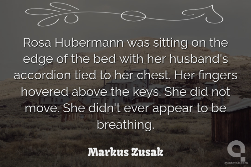 Rosa Hubermann was sitting on the edge of the bed with her husband's accordion tied to her chest. Her fingers hovered above the keys. She did not move. She didn't ever appear to be breathing.