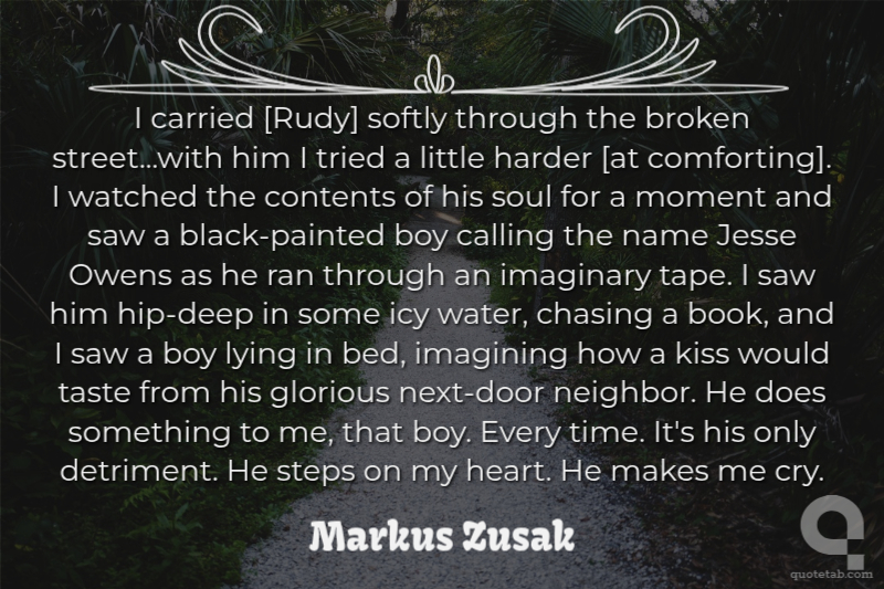 I carried [Rudy] softly through the broken street...with him I tried a little harder [at comforting]. I watched the contents of his soul for a moment and saw a black-painted boy calling the name Jesse Owens as he ran through an imaginary tape. I saw him hip-deep in some icy water, chasing a book, and I saw a boy lying in bed, imagining how a kiss would taste from his glorious next-door neighbor. He does something to me, that boy. Every time. It's his only detriment. He steps on my heart. He makes me cry.
