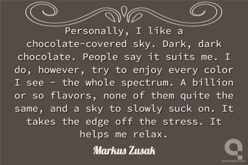 Personally, I like a chocolate-covered sky. Dark, dark chocolate. People say it suits me. I do, however, try to enjoy every color I see - the whole spectrum. A billion or so flavors, none of them quite the same, and a sky to slowly suck on. It takes the edge off the stress. It helps me relax.