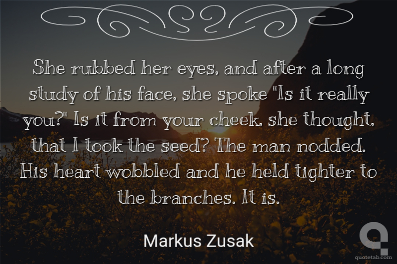 She rubbed her eyes, and after a long study of his face, she spoke "Is it really you?" Is it from your cheek, she thought, that I took the seed? The man nodded. His heart wobbled and he held tighter to the branches. It is.