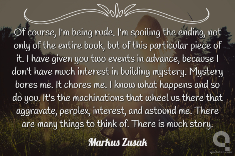 Of course, I'm being rude. I'm spoiling the ending, not only of the entire book, but of this particular piece of it. I have given you two events in advance, because I don't have much interest in building mystery. Mystery bores me. It chores me. I know what happens and so do you. It's the machinations that wheel us there that aggravate, perplex, interest, and astound me. There are many things to think of. There is much story.