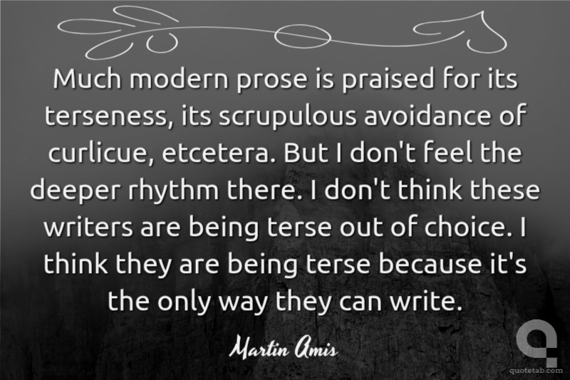 Much modern prose is praised for its terseness, its scrupulous avoidance of curlicue, etcetera. But I don't feel the deeper rhythm there. I don't think these writers are being terse out of choice. I think they are being terse because it's the only way they can write.