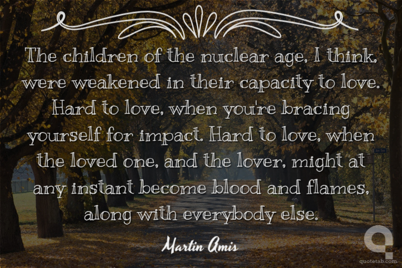 The children of the nuclear age, I think, were weakened in their capacity to love. Hard to love, when you're bracing yourself for impact. Hard to love, when the loved one, and the lover, might at any instant become blood and flames, along with everybody else.