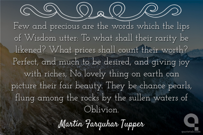 Few and precious are the words which the lips of Wisdom utter: To what shall their rarity be likened? What prices shall count their worth? Perfect, and much to be desired, and giving joy with riches, No lovely thing on earth can picture their fair beauty. They be chance pearls, flung among the rocks by the sullen waters of Oblivion.