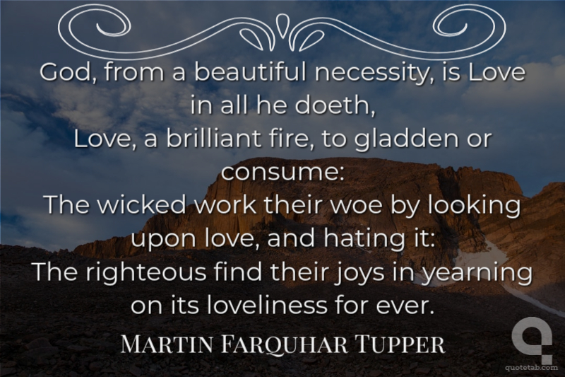 God, from a beautiful necessity, is Love in all he doeth, Love, a brilliant fire, to gladden or consume: The wicked work their woe by looking upon love, and hating it: The righteous find their joys in yearning on its loveliness for ever.