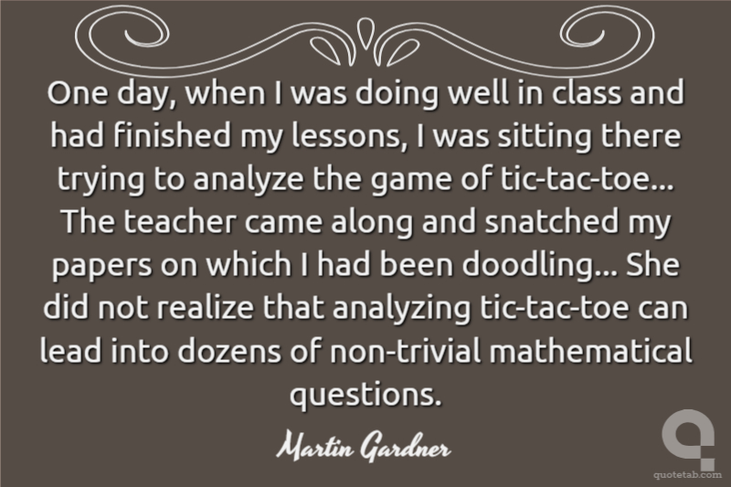 One day, when I was doing well in class and had finished my lessons, I was sitting there trying to analyze the game of tic-tac-toe... The teacher came along and snatched my papers on which I had been doodling... She did not realize that analyzing tic-tac-toe can lead into dozens of non-trivial mathematical questions.