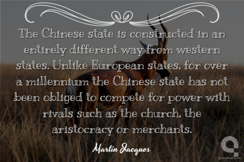 The Chinese state is constructed in an entirely different way from western states. Unlike European states, for over a millennium the Chinese state has not been obliged to compete for power with rivals such as the church, the aristocracy or merchants.