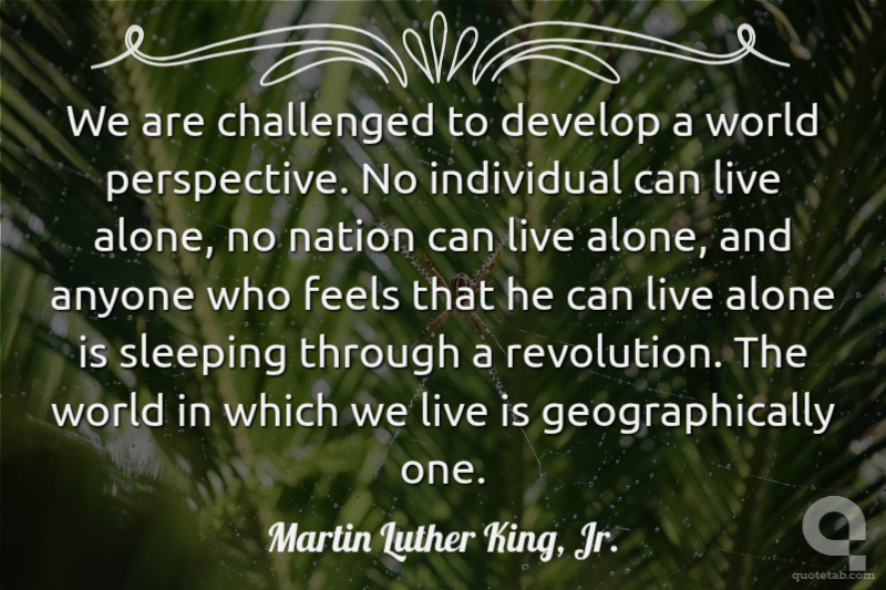 We are challenged to develop a world perspective. No individual can live alone, no nation can live alone, and anyone who feels that he can live alone is sleeping through a revolution. The world in which we live is geographically one.