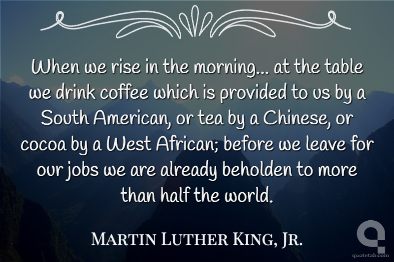 When we rise in the morning... at the table we drink coffee which is provided to us by a South American, or tea by a Chinese, or cocoa by a West African; before we leave for our jobs we are already beholden to more than half the world.