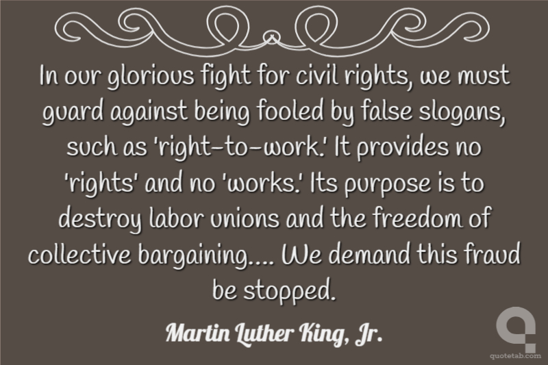 In our glorious fight for civil rights, we must guard against being fooled by false slogans, such as 'right-to-work.' It provides no 'rights' and no 'works.' Its purpose is to destroy labor unions and the freedom of collective bargaining…. We demand this fraud be stopped.