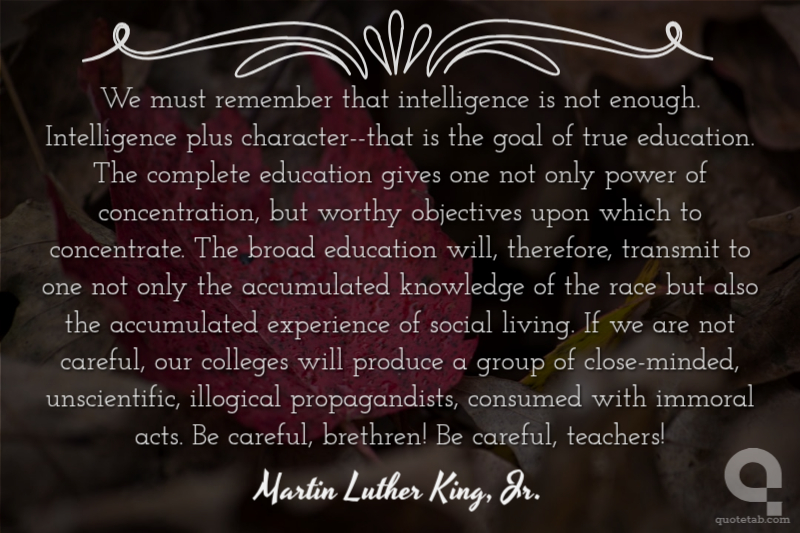 We must remember that intelligence is not enough. Intelligence plus character--that is the goal of true education. The complete education gives one not only power of concentration, but worthy objectives upon which to concentrate. The broad education will, therefore, transmit to one not only the accumulated knowledge of the race but also the accumulated experience of social living. If we are not careful, our colleges will produce a group of close-minded, unscientific, illogical propagandists, consumed with immoral acts. Be careful, brethren! Be careful, teachers!