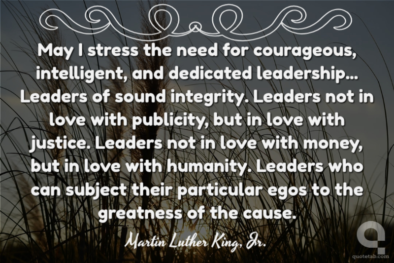 May I stress the need for courageous, intelligent, and dedicated leadership... Leaders of sound integrity. Leaders not in love with publicity, but in love with justice. Leaders not in love with money, but in love with humanity. Leaders who can subject their particular egos to the greatness of the cause.