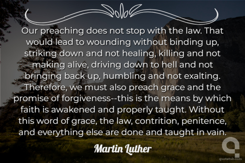 Our preaching does not stop with the law. That would lead to wounding without binding up, striking down and not healing, killing and not making alive, driving down to hell and not bringing back up, humbling and not exalting. Therefore, we must also preach grace and the promise of forgiveness--this is the means by which faith is awakened and properly taught. Without this word of grace, the law, contrition, penitence, and everything else are done and taught in vain.