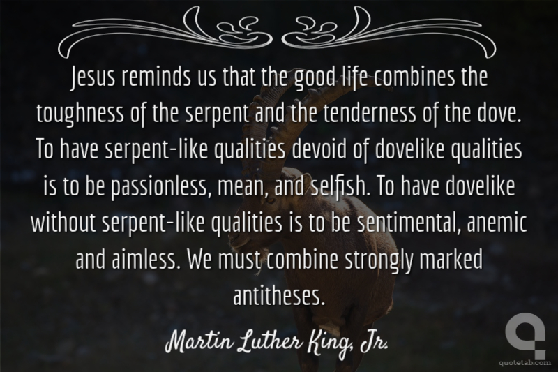 Jesus reminds us that the good life combines the toughness of the serpent and the tenderness of the dove. To have serpent-like qualities devoid of dovelike qualities is to be passionless, mean, and selfish. To have dovelike without serpent-like qualities is to be sentimental, anemic and aimless. We must combine strongly marked antitheses.