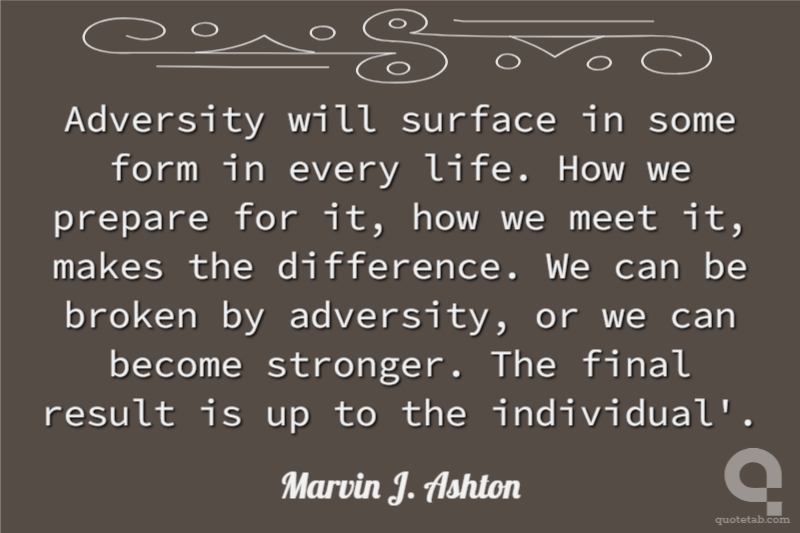 Adversity will surface in some form in every life. How we prepare for it, how we meet it, makes the difference. We can be broken by adversity, or we can become stronger. The final result is up to the individual'.