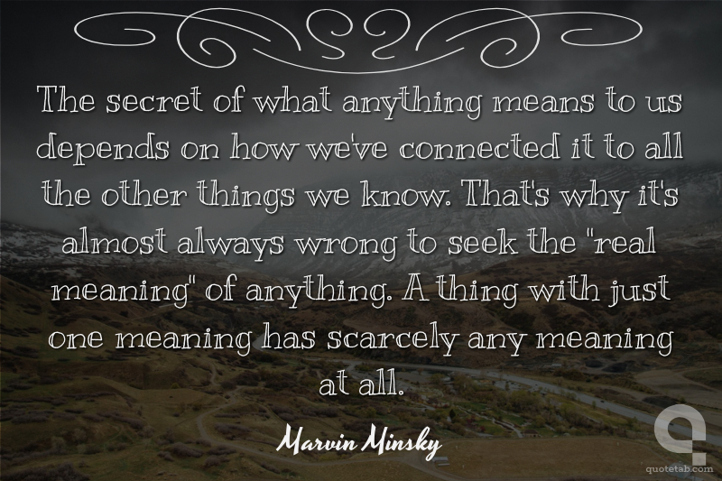 The secret of what anything means to us depends on how we've connected it to all the other things we know. That's why it's almost always wrong to seek the "real meaning" of anything. A thing with just one meaning has scarcely any meaning at all.