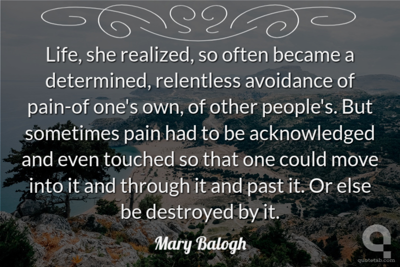 Life, she realized, so often became a determined, relentless avoidance of pain-of one's own, of other people's. But sometimes pain had to be acknowledged and even touched so that one could move into it and through it and past it. Or else be destroyed by it.