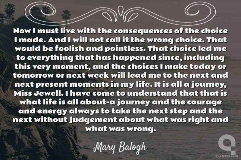 Now I must live with the consequences of the choice I made. And I will not call it the wrong choice. That would be foolish and pointless. That choice led me to everything that has happened since, including this very moment, and the choices I make today or tomorrow or next week will lead me to the next and next present moments in my life. It is all a journey, Miss Jewell. I have come to understand that that is what life is all about-a journey and the courage and energy always to take the next step and the next without judgement about what was right and what was wrong.